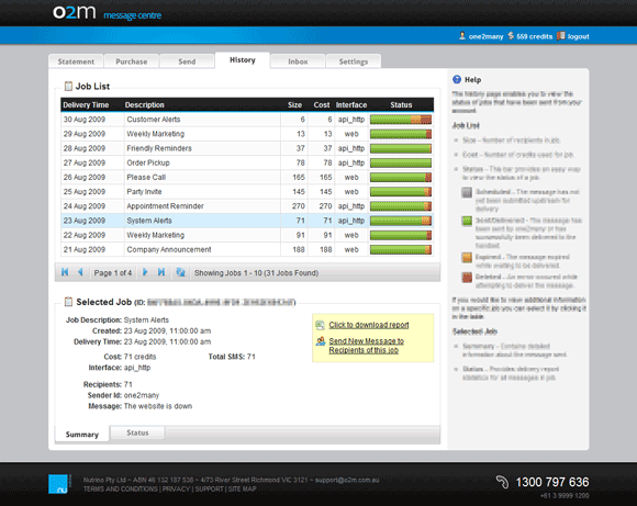 Additional information can be viewed by clicking on a row in the job list. When a job is selected you will be able to see the Sender Id and Message you sent in the 'Summary' tab and view a breakdown on the status from all messages sent in the 'Status' tab.